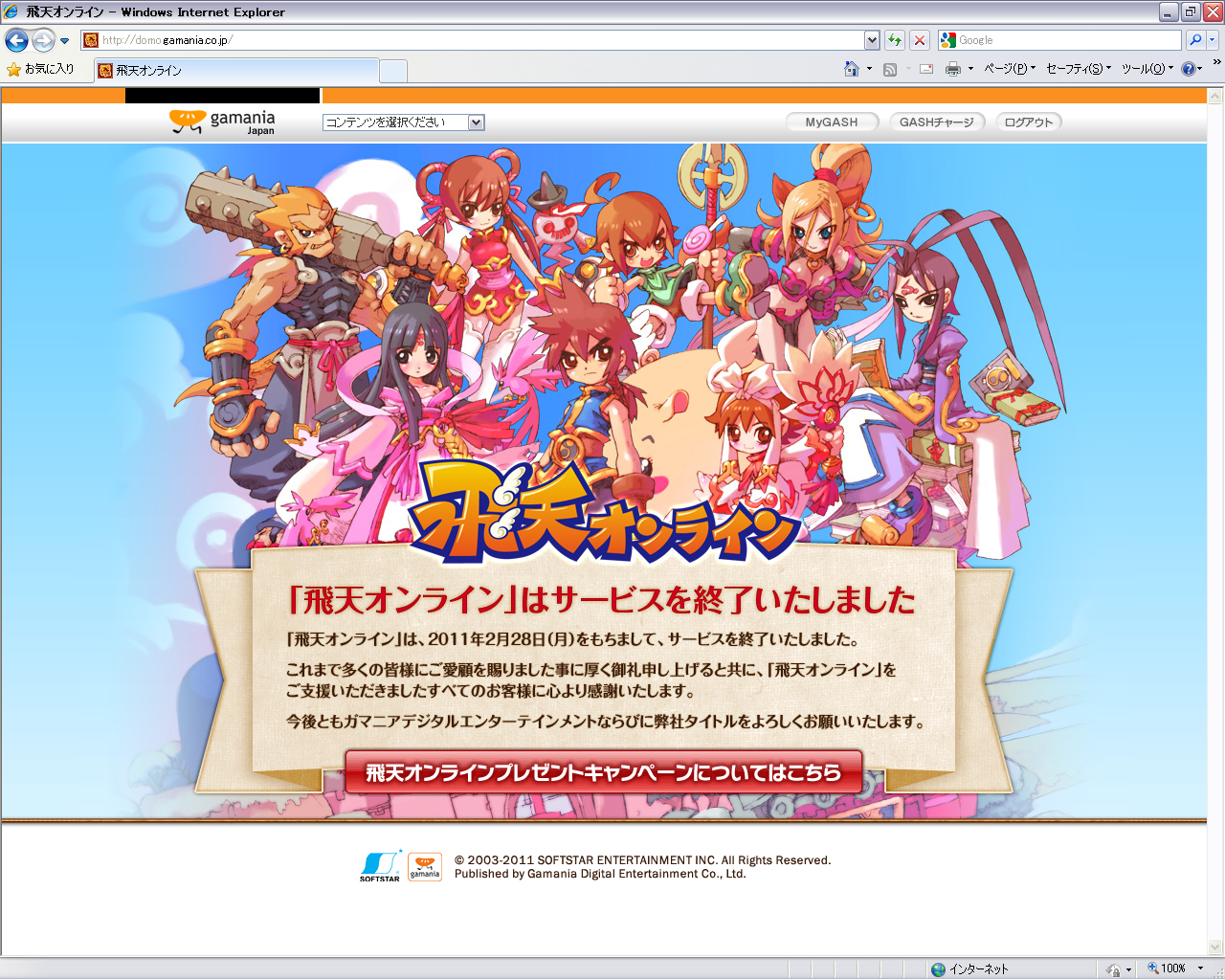 以前から楽しんでおりました『飛天オンライン』ですが、既に公式サイトで発表されている通り、2011年2月28日をもってサービス終了と相成りました。