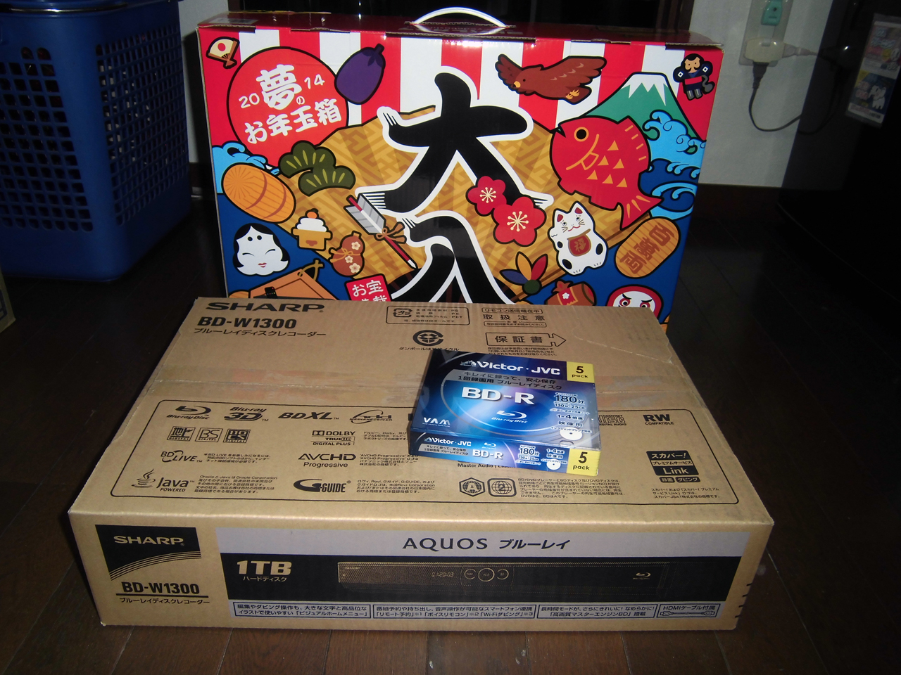 んで、帰宅して中を確認すると、SHARPのBD-W1300と書き込み用のBD-R 5枚パックが入っていた。Wチューナー搭載でHDDは1TBと、まぁ必要十分なスペックだろう。念の為価格.comで相場を調べてみると、大体50000円位する機種だったので、ちょっと得した気分に♪欲を言えば、テレビがパナソニック製なので、レコーダーも同じパナソニック製のヤツが良かったんだが、まぁ、野暮な事は言うまい。(笑